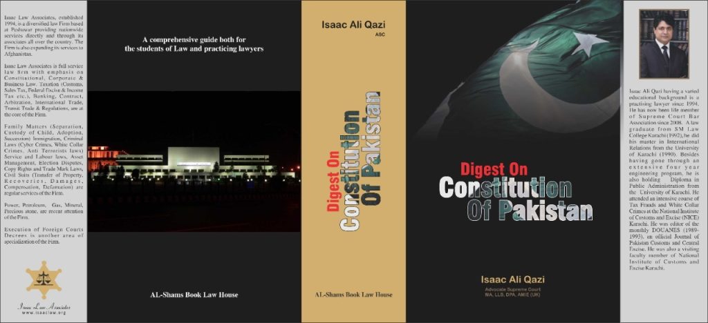 “Digest on Constitution of Pakistan” is an endeavor to put together case law on the Constitution of Pakistan with great care and precision. Over the years, in Pakistan, unprecedented case law on Consitution has been developed. The reader would feel along with historic and rhetoric aspect, the emerging currents of constitutional law in Pakistan. In the Digest both theoretical and practical aspects of the constitutional law have been attended to. This Digest would be a great help for practicing lawyers and would be a treasure for non-practicing lawyers and students of law. The Digest would also prove its worth to those foreign students of law who are keen to abreast with developing constitutional law in Pakistan.